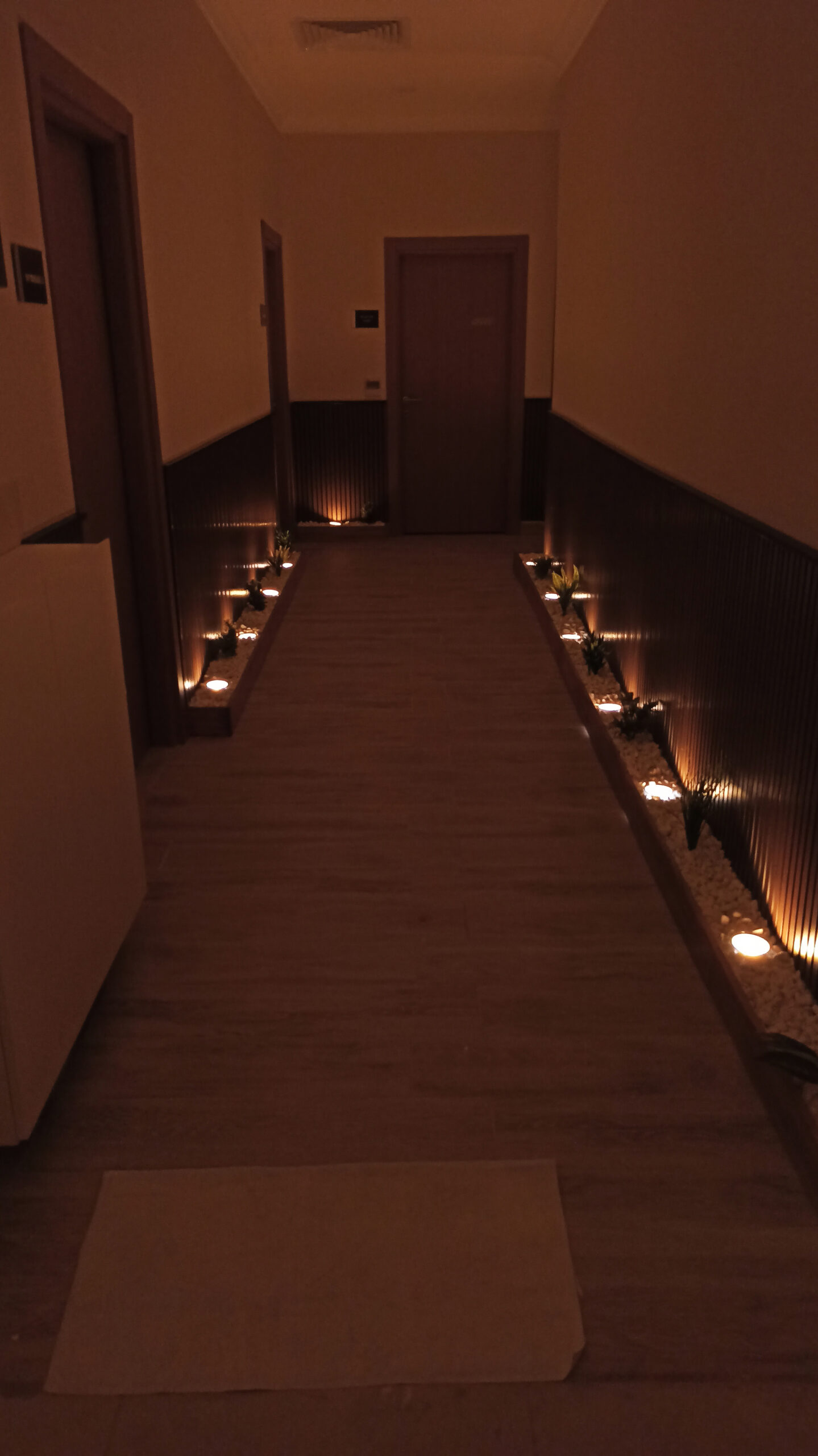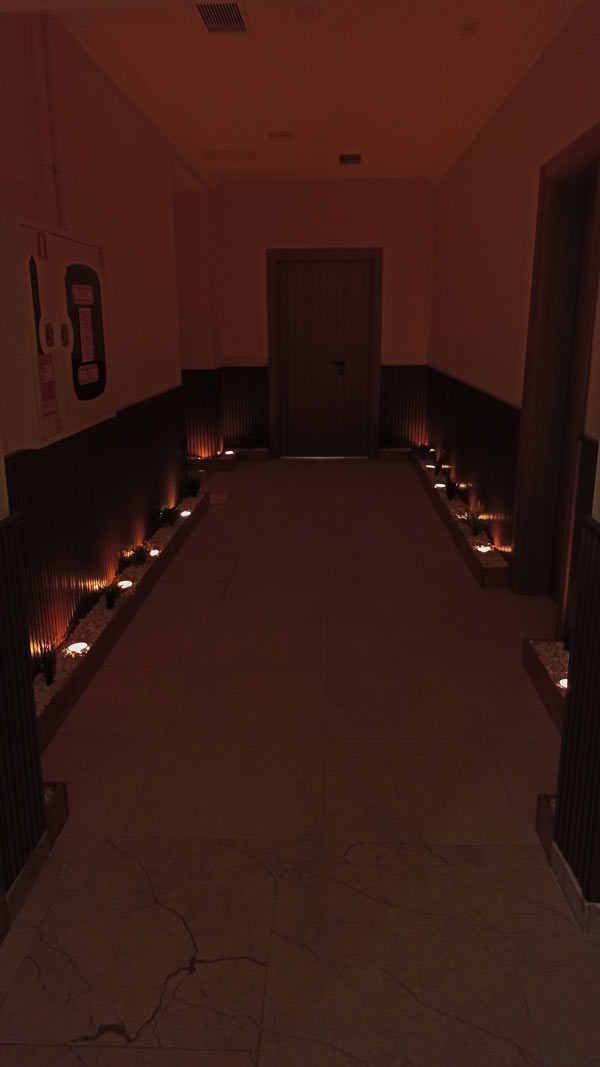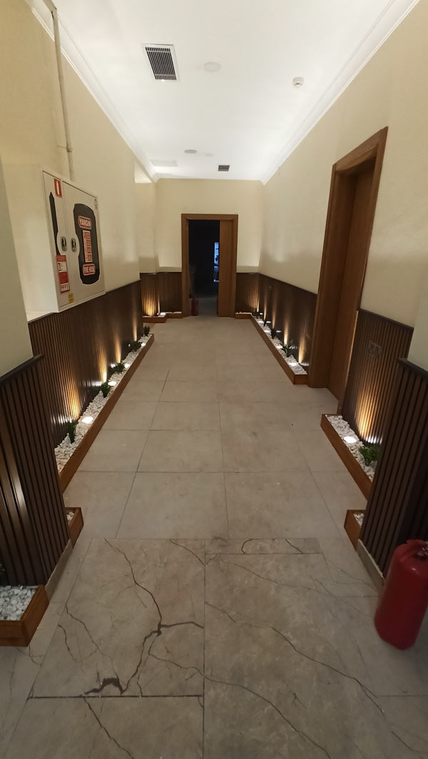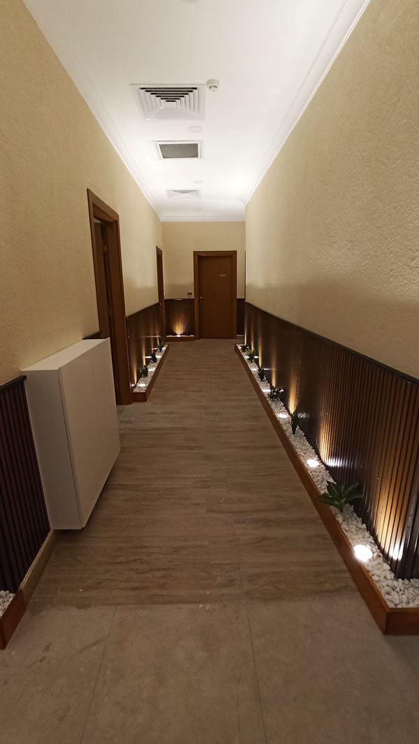 Hol alanında konumlandırılan LED aydınlatmalar, taş yüzeylerin dokusunu vurgularken aynı zamanda saunanın sıcak atmosferini hissettiren bir ışık senaryosu oluşturdu. Işık ve malzeme birlikteliğiyle elde edilen bu etki, mekâna hem estetik hem de deneyimsel bir derinlik kazandırdı.
